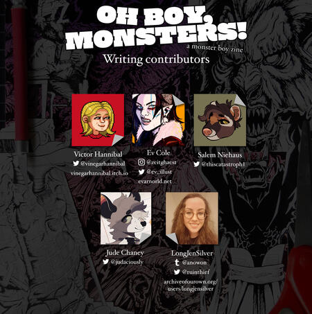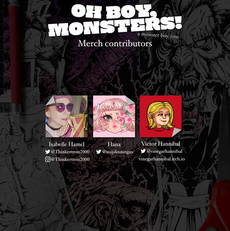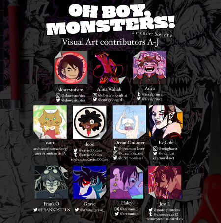 felix (they/he) is a freelance artist, writer, and stay at home parent. they are the admin and curator of the monster boy zine. they have five+ years experience with the twitter/tumblr zine scene, including admin and moderation duties. they also have more experience running their own shop and previous solo projects. they love monsters of all shapes and sizes, although they have a special fondness for werewolves and aliens.